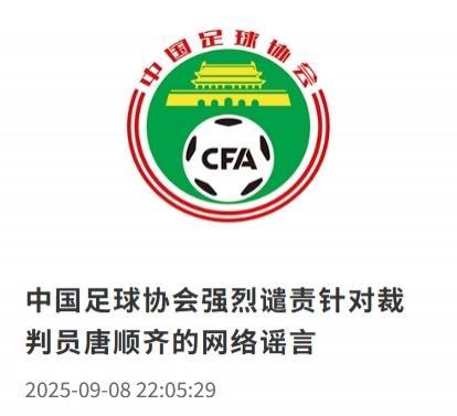 “中国足球协会高度重视此次事件,强烈谴责个别极端网民在网络上对足球从业人员进行诽谤中伤和造谣生事。 中国足球协会坚决支持唐顺齐采取法律手段维护自身的权益,呼吁网络平台严格把关审核以杜绝谣言传播,也希望广大球迷共同珍惜和维护良好的足球发展环境。”